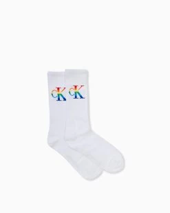 celebrate PRIDE in rainbow adorned apparel with iconic Calvin Klein Monogram logo detailing. these socks feature a cotton stretch fabrication, modern crew style with ribbed cuff, and cushion logo.