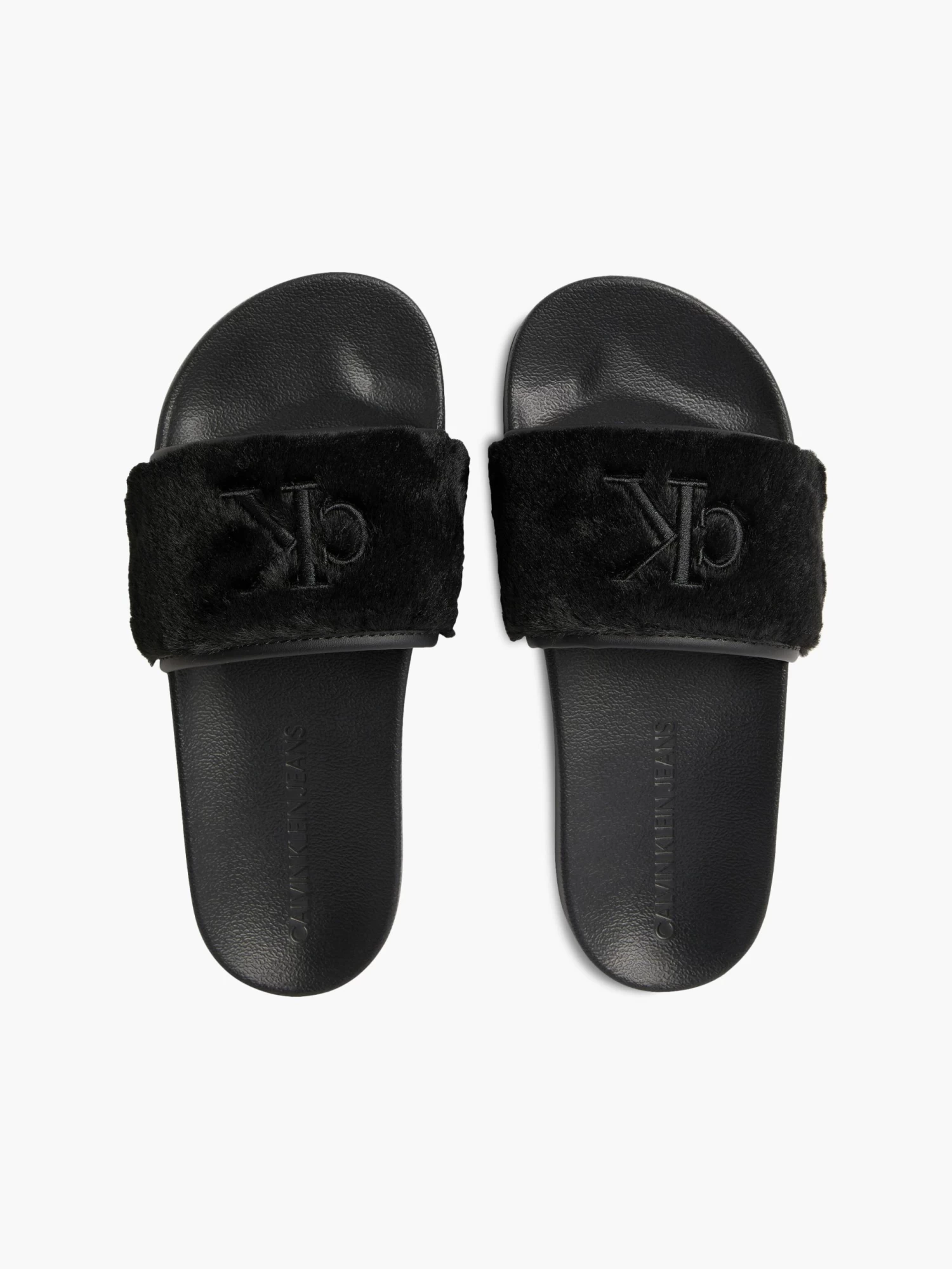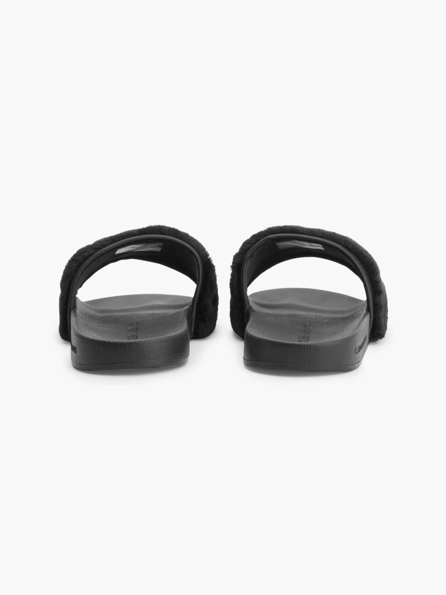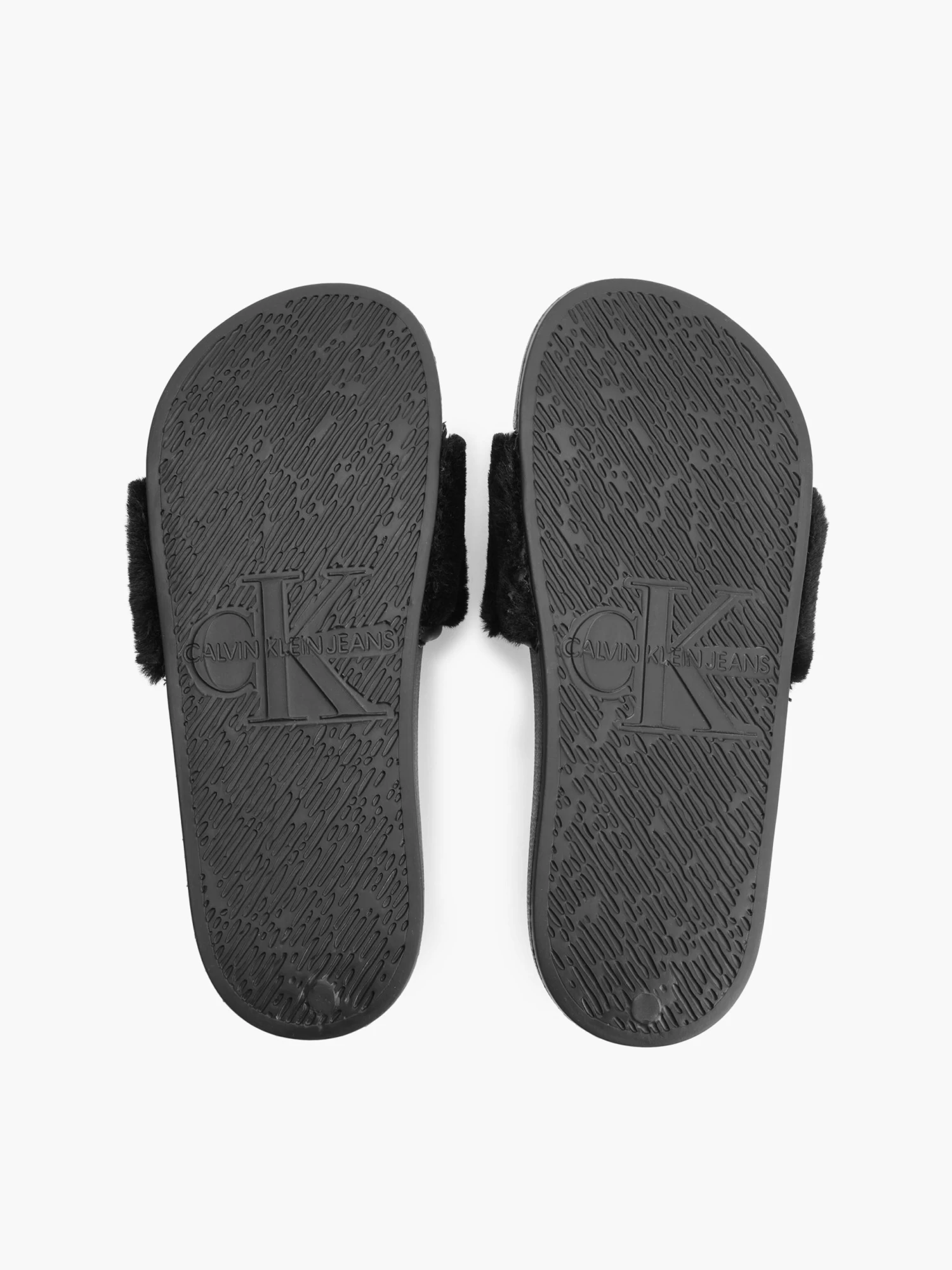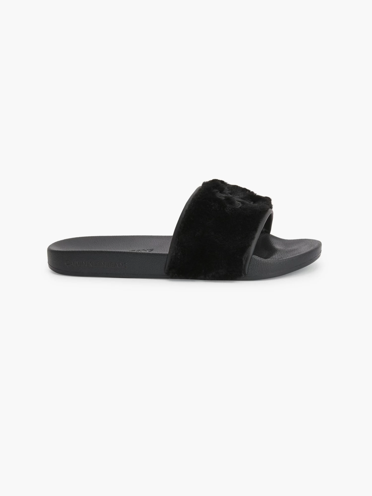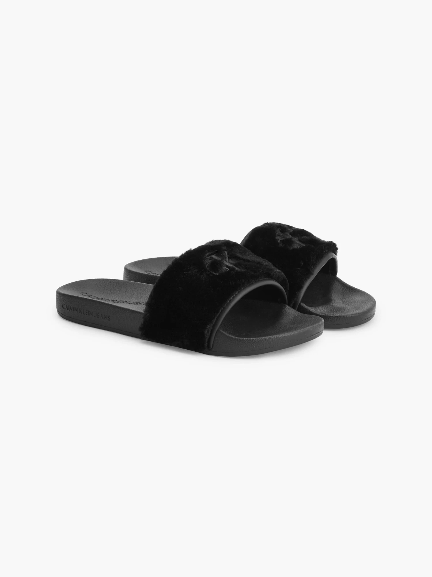 A classic monogram features to the faux fur strap of these slides. Complete with a recycled polyester lining and an embossed EVA outsole.