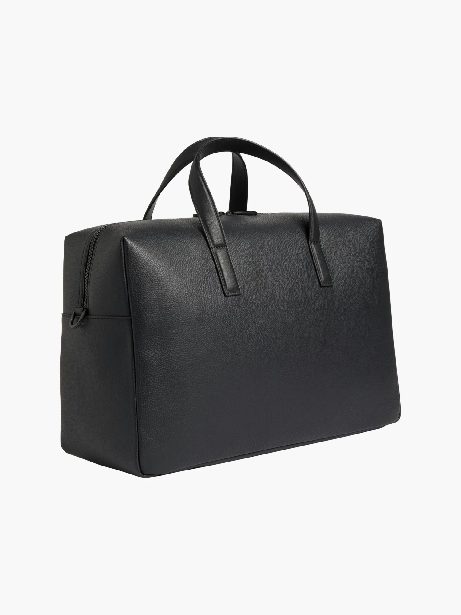 Crafted from a recycled faux leather fabrication, this weekend bag features reinforced top handles, an additional shoulder strap, a soft pebbled texture, and a metallic embossed logo on the front.