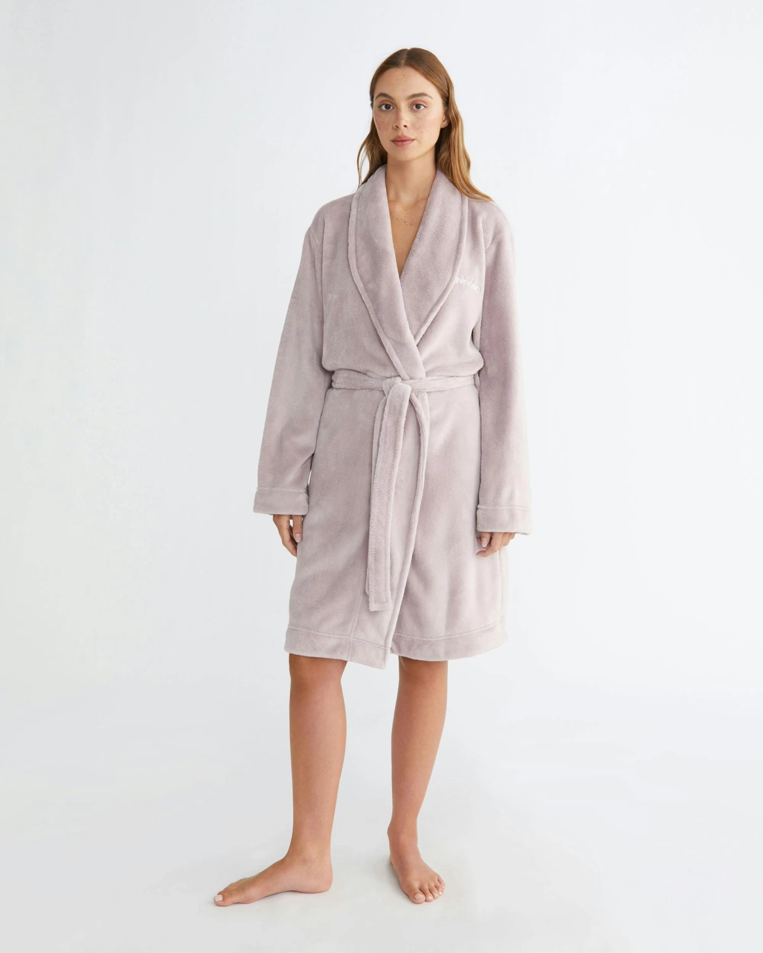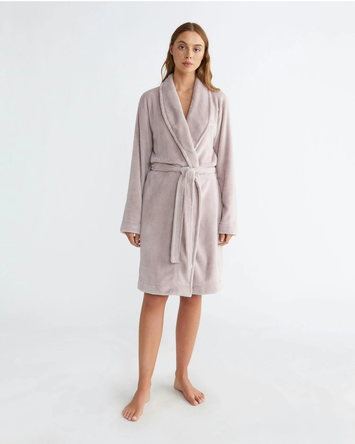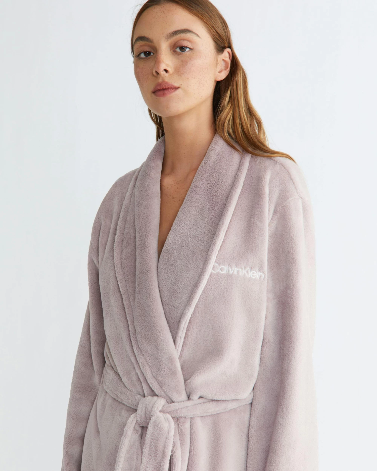 Designed for comfort, this robe is crafted from a fluffy plushed polyester and complete with a coordinating waist tie and the signature CK logo at the chest.