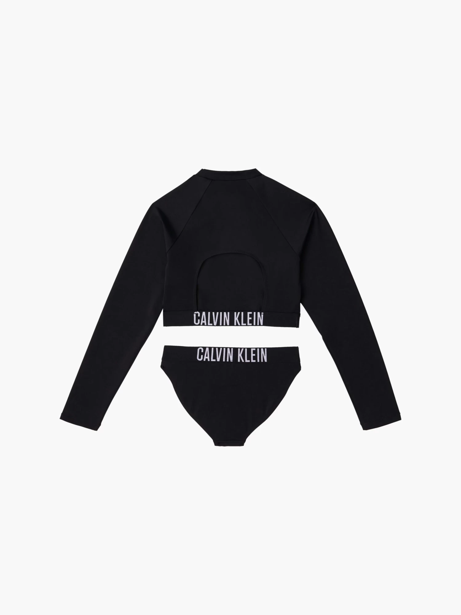This girls rash guard set is cut to a cropped fit with high-collar, long sleeves for full coverage and cut out back.