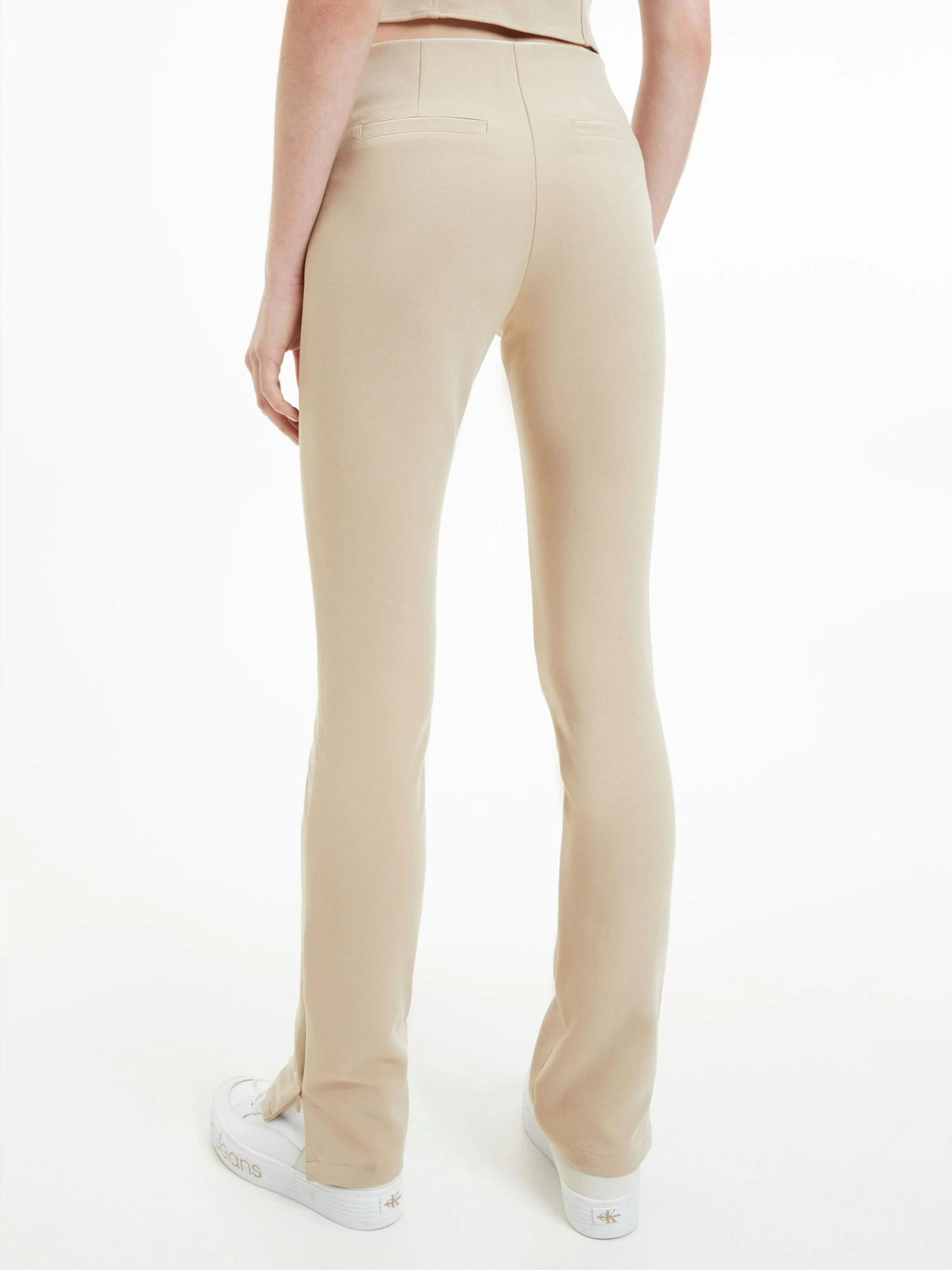 These trousers are a high rise, slim fit shape. Complete with an embroidered Calvin Klein Jeans logo at the waist and zip fly at the front.