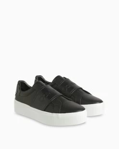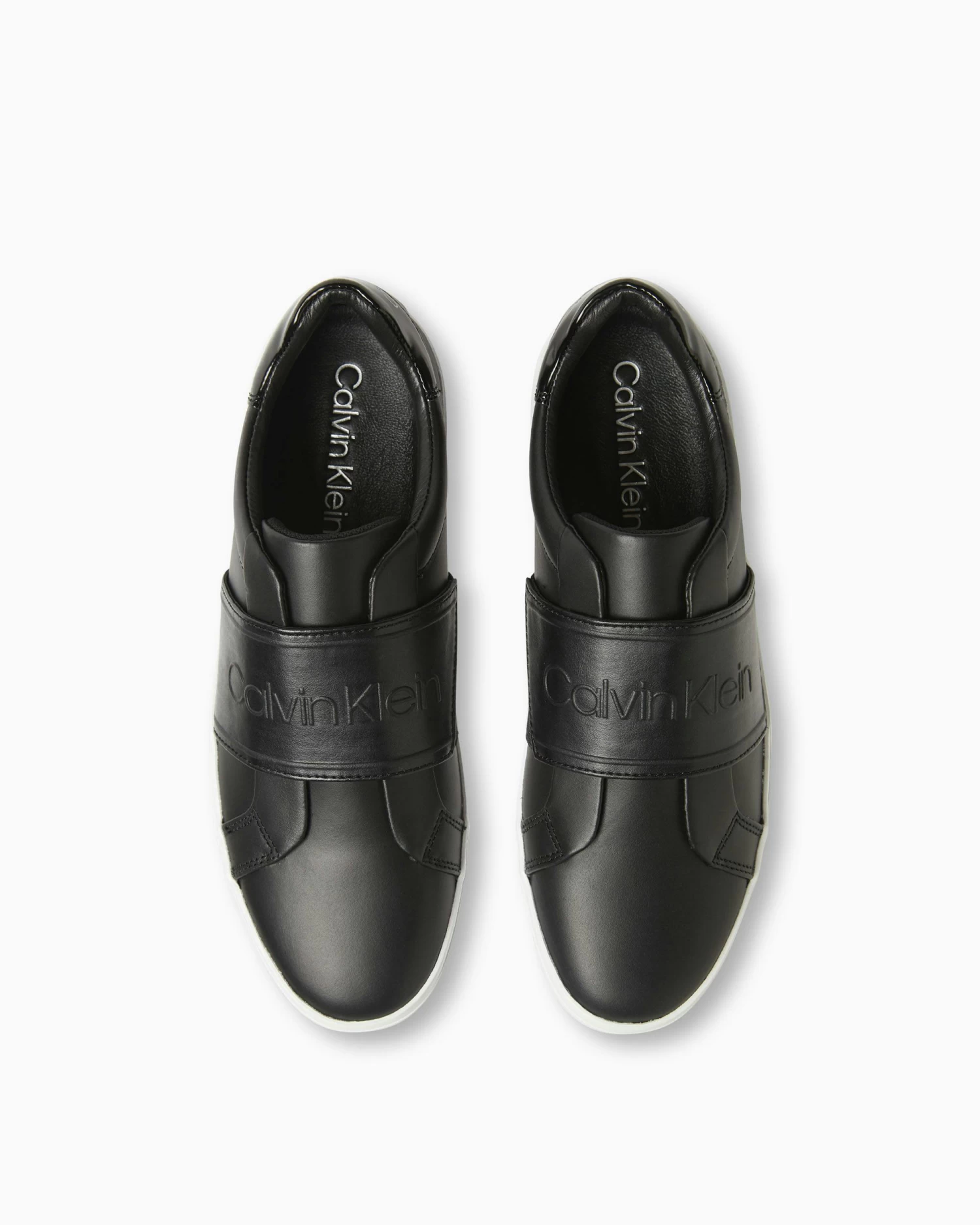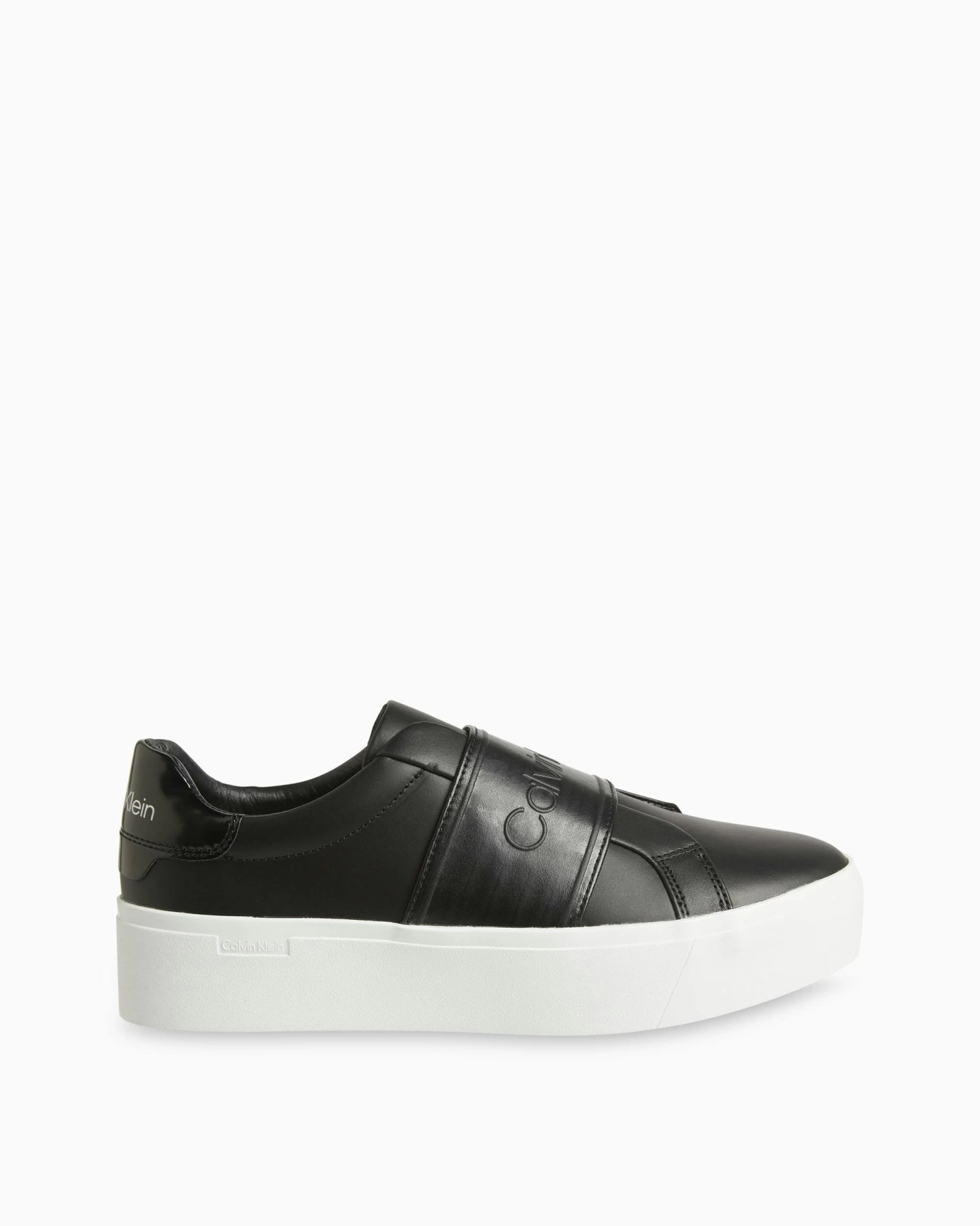 Crafted from genuine leather and featuring an embossed logo on the strap, elevate your look with these slip-on platform trainers from Calvin Kiein.