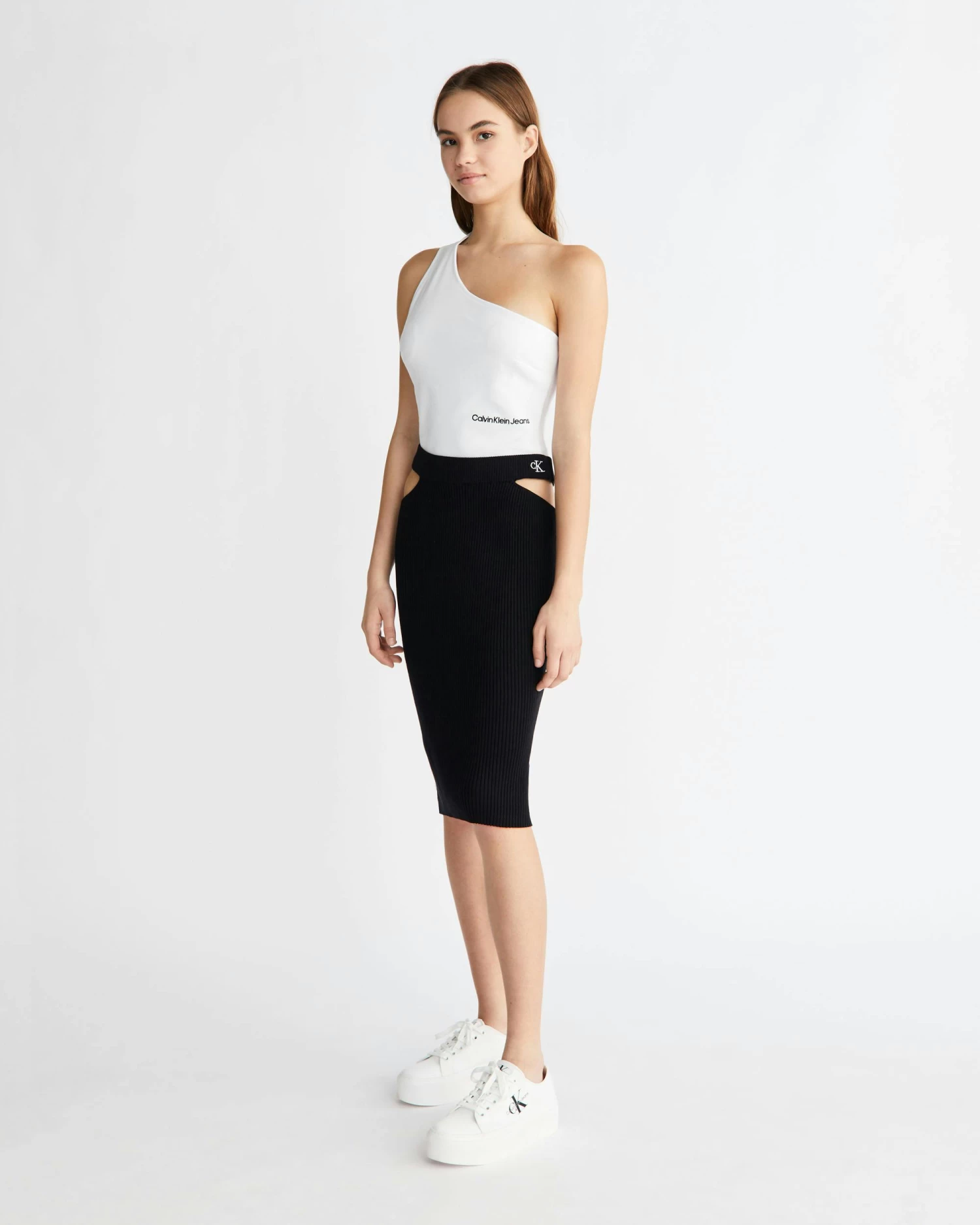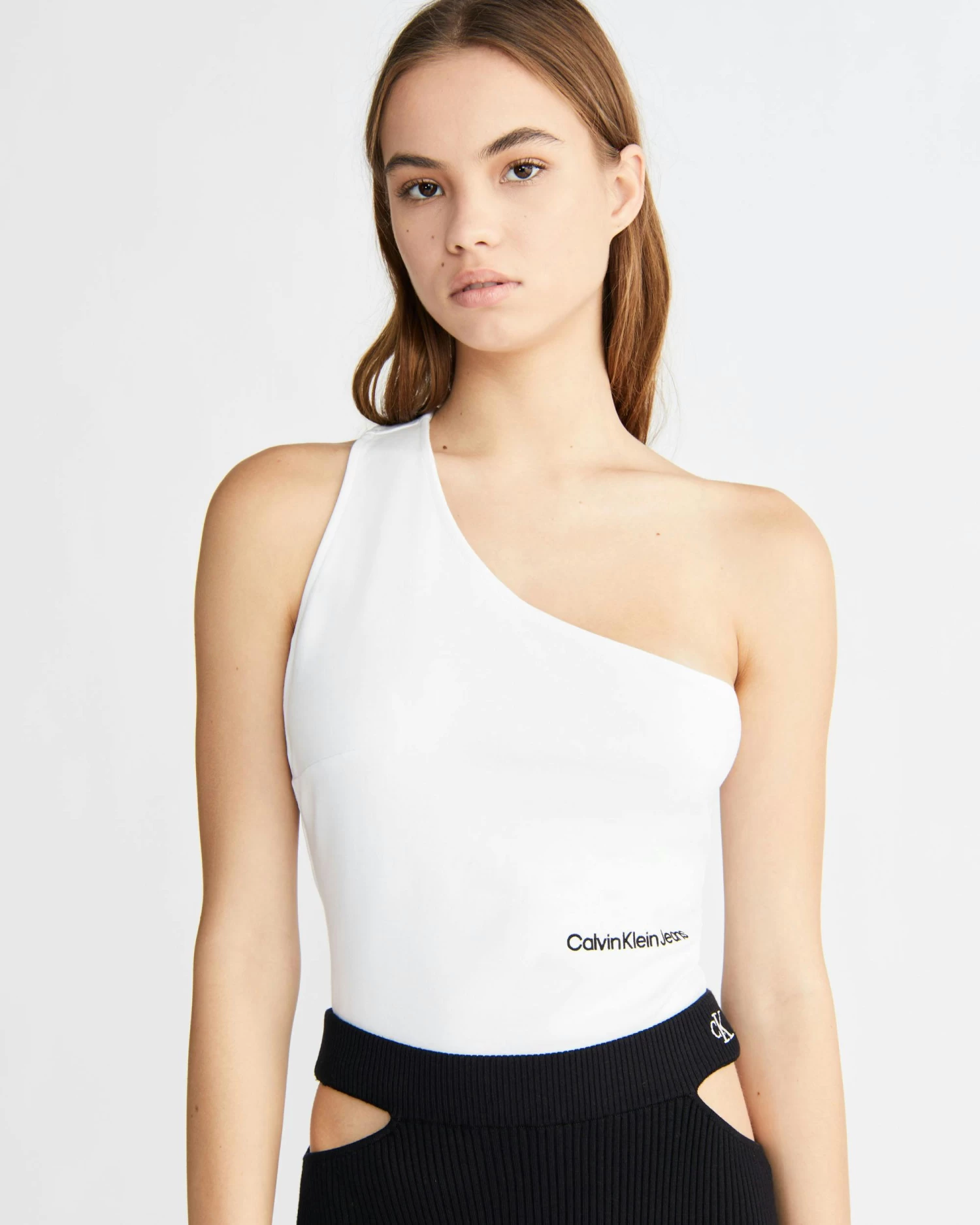 Clean. Effortless. Inclusive. Discover quintessential Calvin styles in an extended size range, designed for every body. Skin-baring lines, mindful materials. This asymmetric one-shoulder top is crafted with eco-responsible viscose fibres.