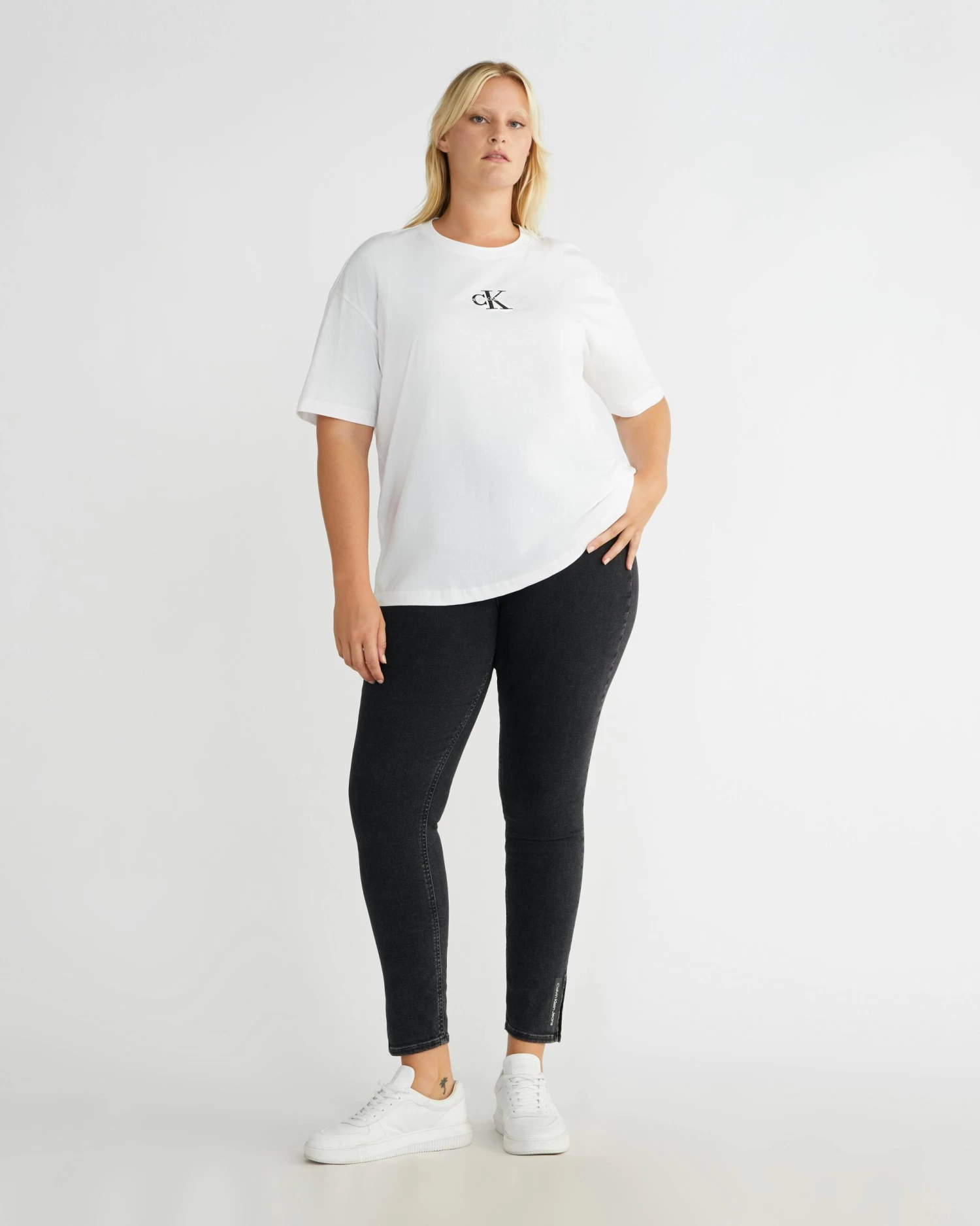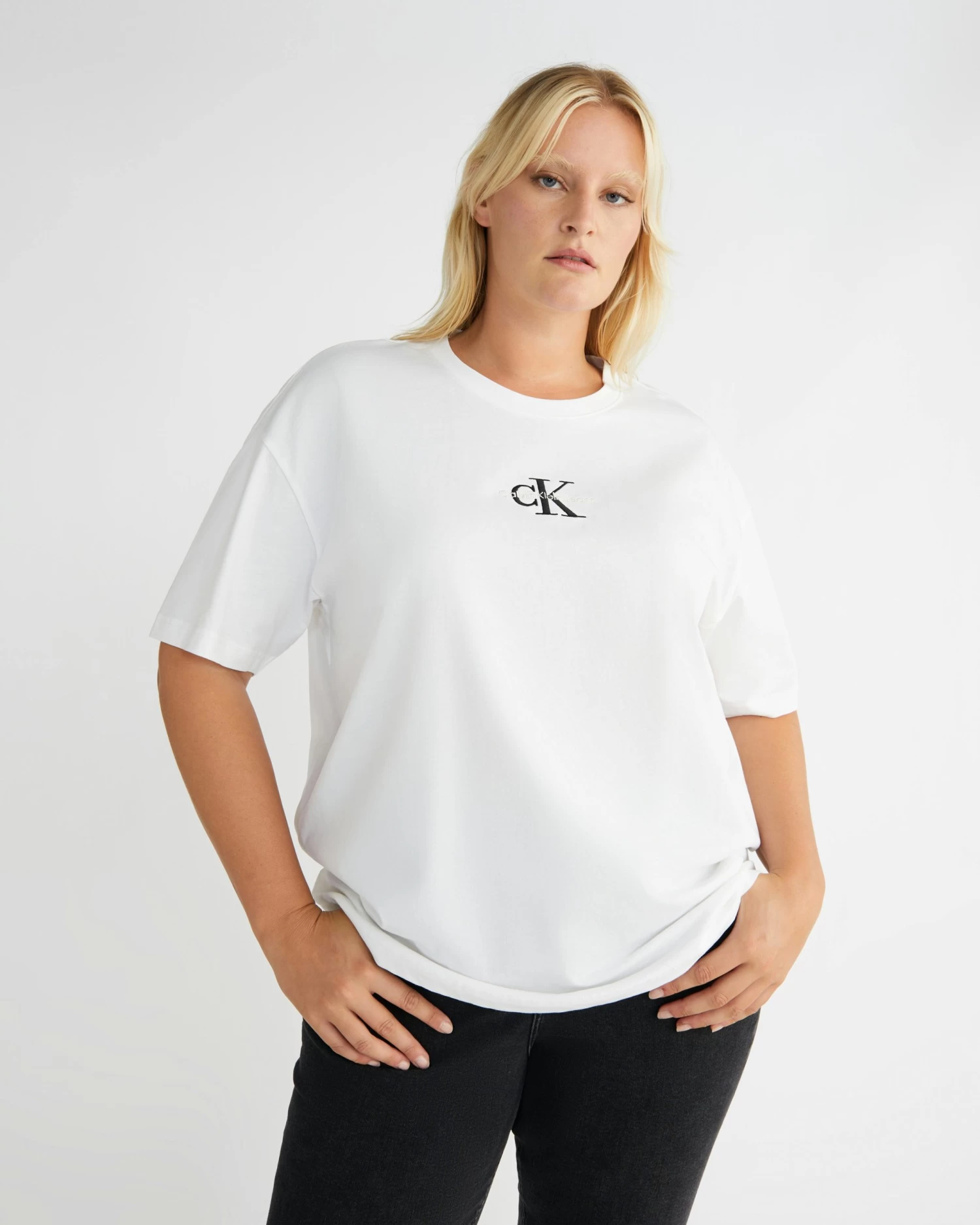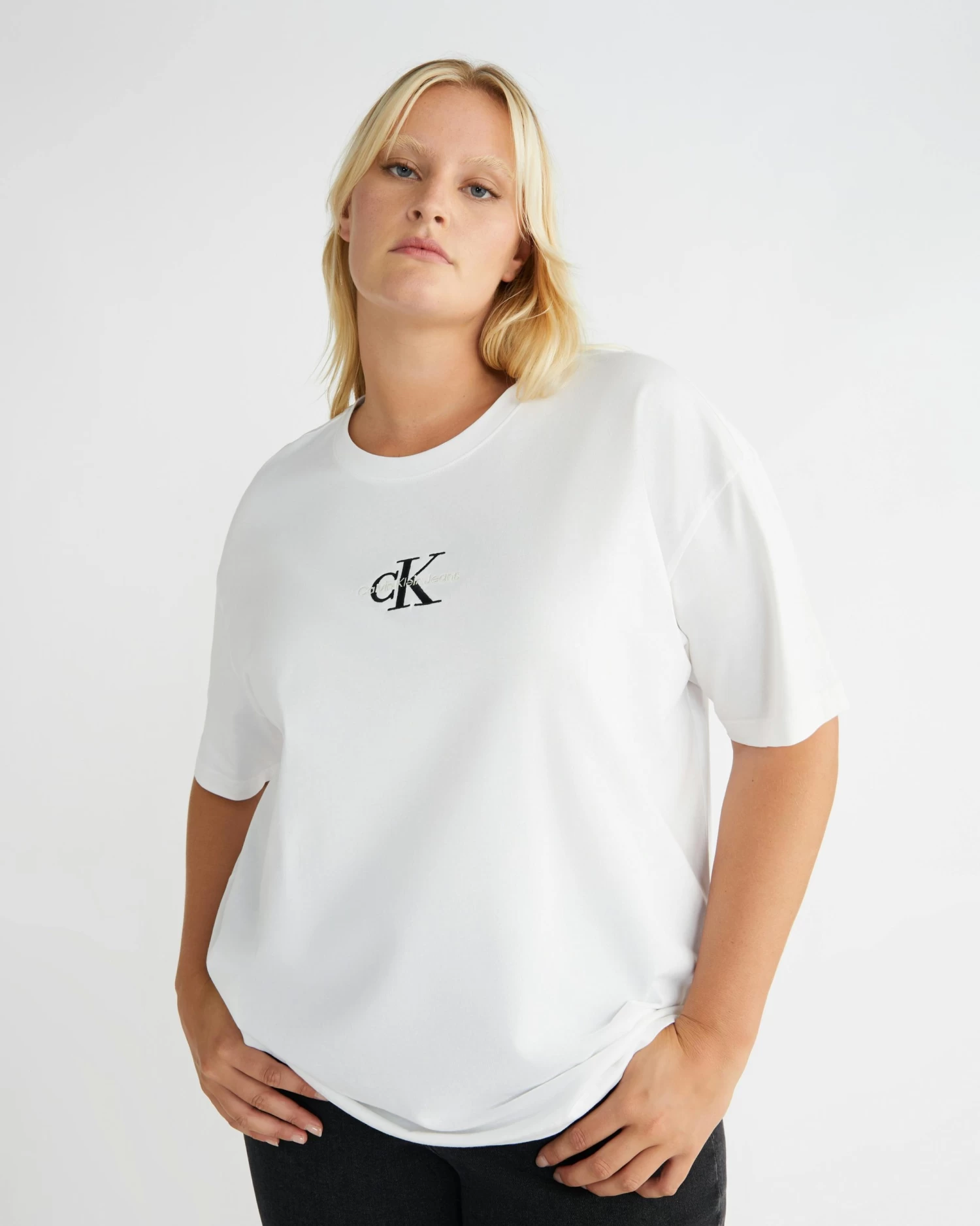 Clean. Effortless. Inclusive. Discover quintessential Calvin styles in an extended size range, designed for every body. Update your wardrobe with these Womens Plus Monogram Slim Fit T-Shirt from Calvin Klein.