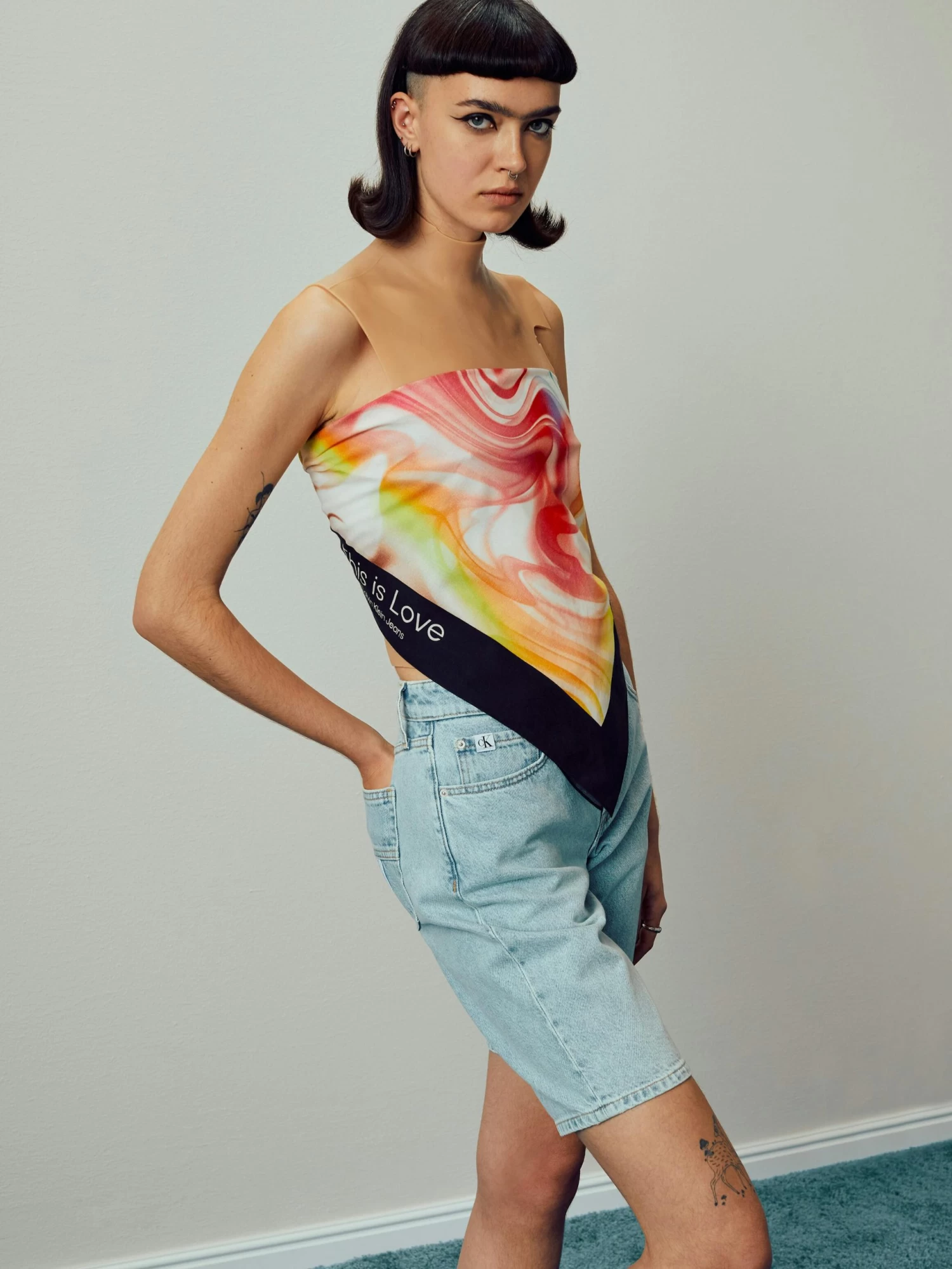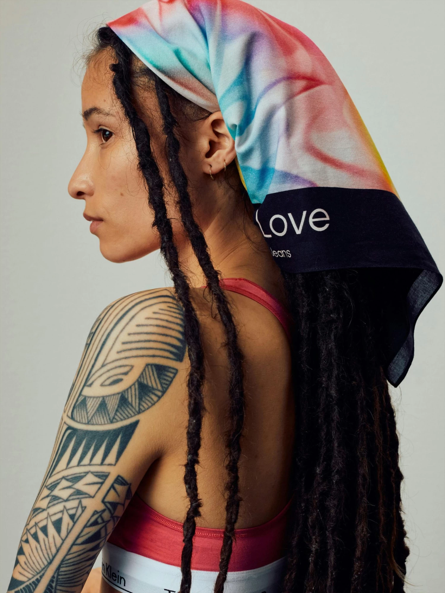 Wear it with pride. The latest Calvin Klein Pride capsule is here: classic silhouettes, organic materials and signature branding in a rainbow of colours. Lightweight in crisp cotton, this bandana is accented with a rainbow logo detail.