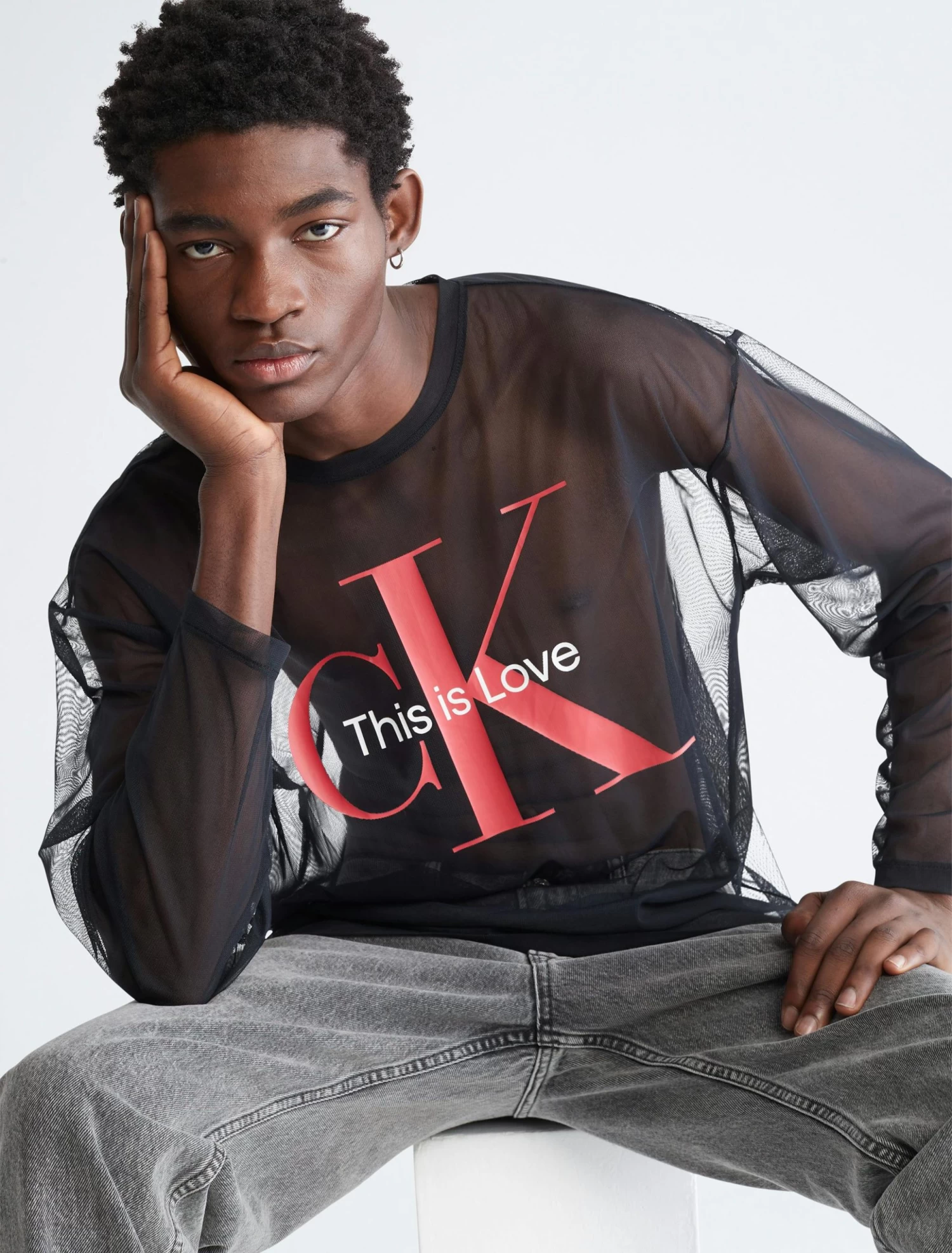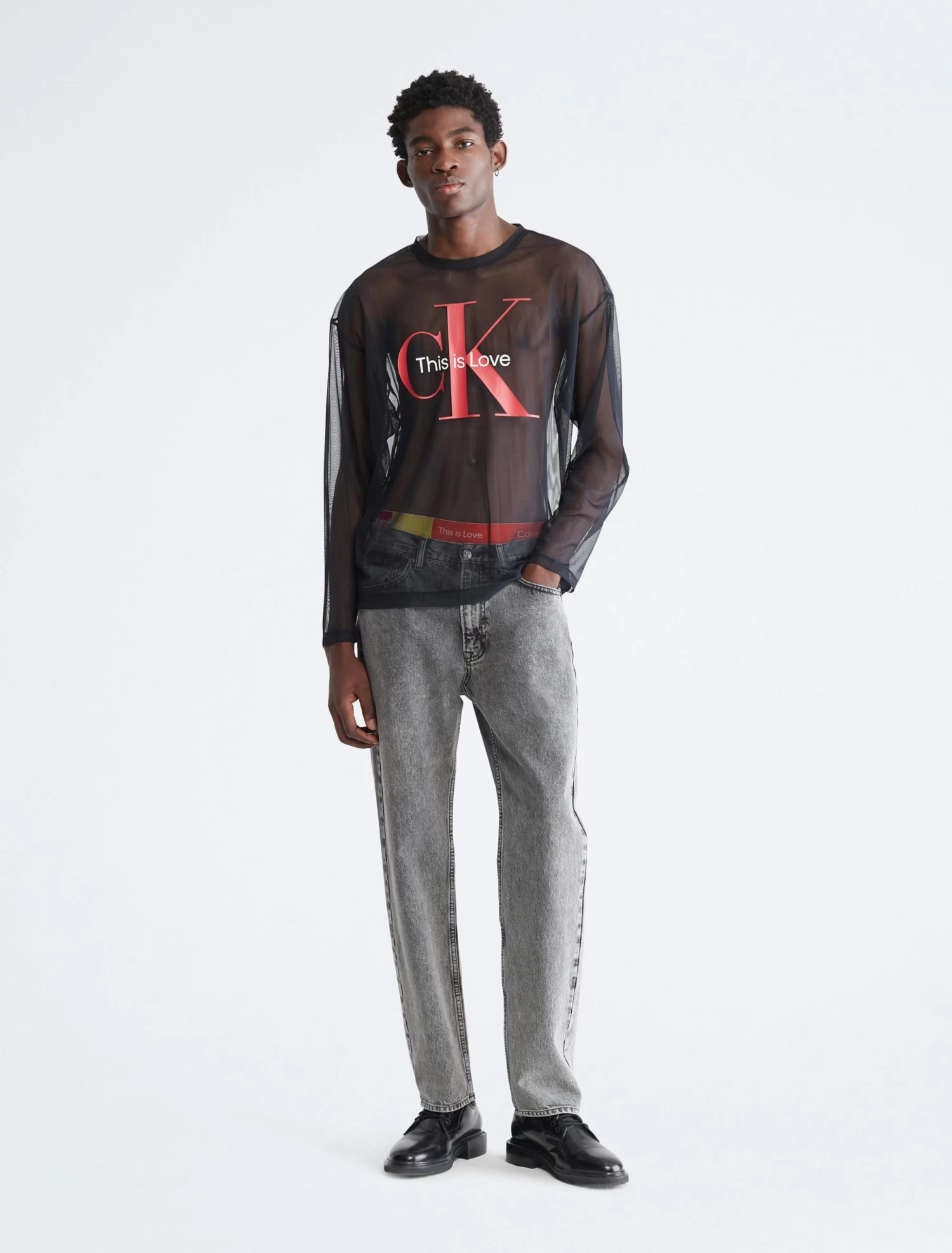 Classic styles in celebration of Pride, designed in a limited edition rainbow palette. Styled with sheer mesh, this t-shirt can be worn alone or layered for a dimensional outfit. Made with long sleeves and a crewneck. Features an oversized CK monogram logo design at the front.