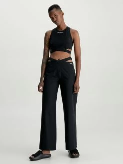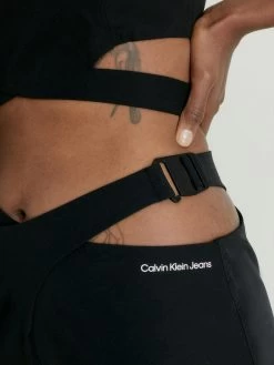 Clean. Effortless. Inclusive. Discover quintessential Calvin styles in an extended size range, designed for every body. Cut out buckled accents at the waist elevate the silhouette of these slim black trousers. Made with 85% eco-responsible fabric.